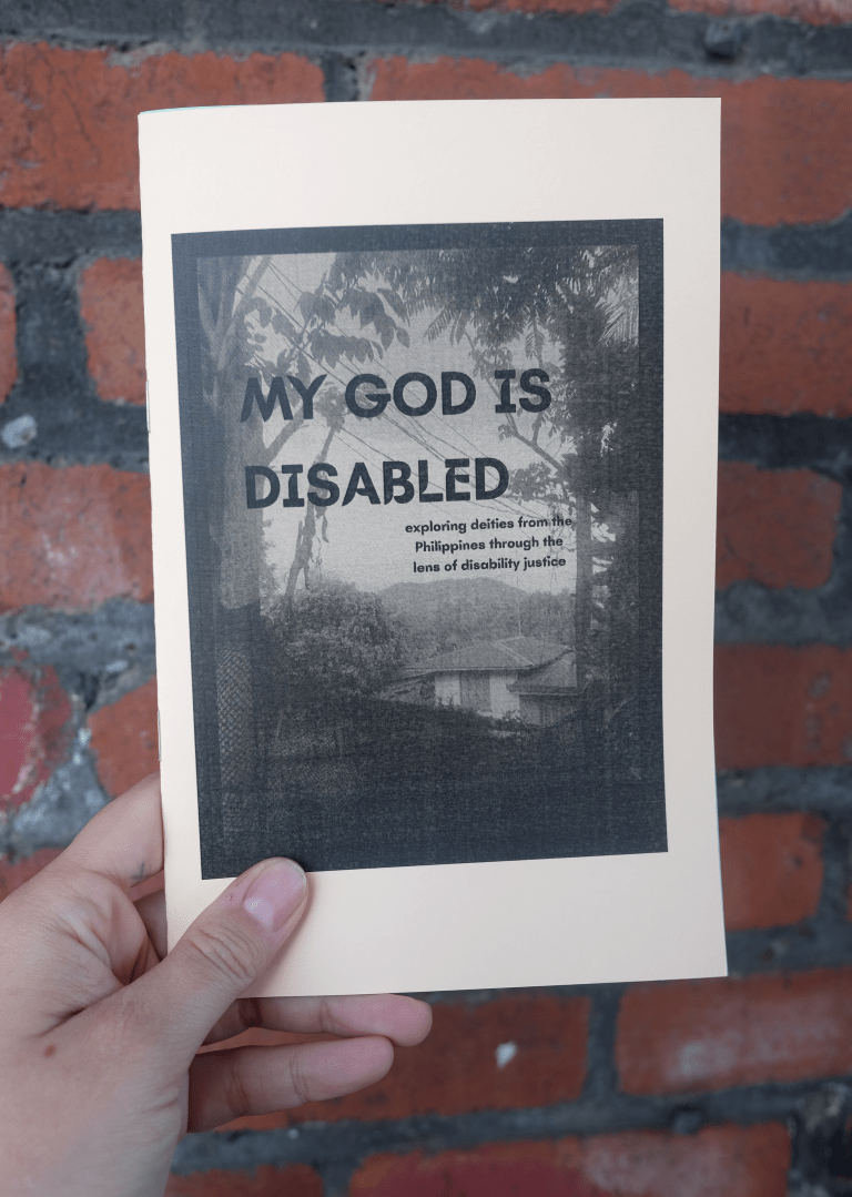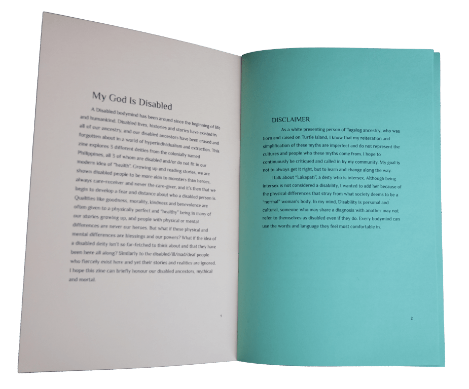 zine explores 3 different deities from the colonially named Philippines, all 3 of whom are disabled and/or do not fit in our modern idea of “health”.”
