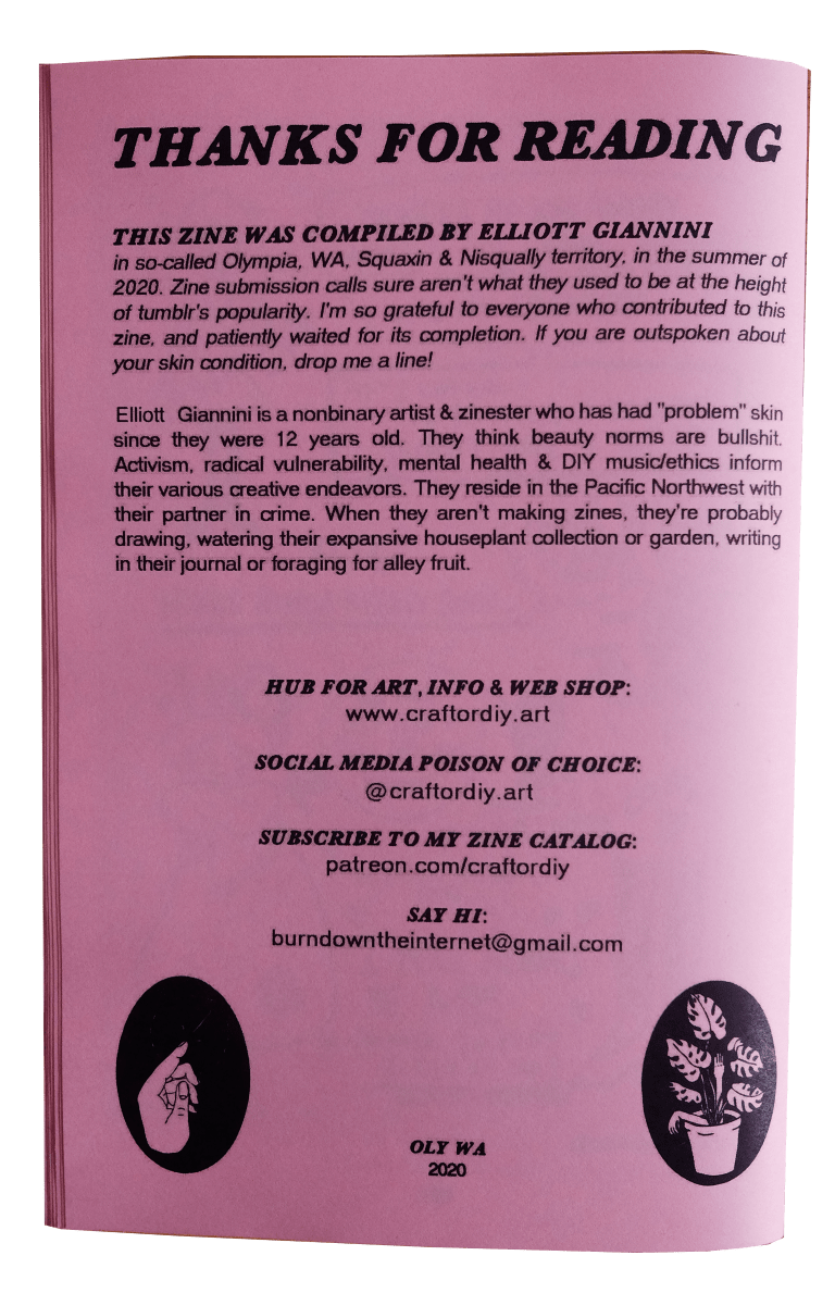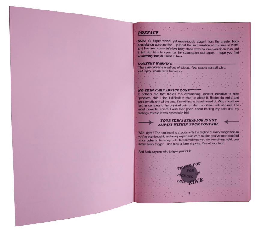 “the first issue of this zine was compiled in 2015, as an honest attempt to usher skin conditions into the body acceptance movement. this new issue includes entries on acne, rosacea, eczema, psoriasis, chronic urticaria, skin discoloration, darier disease, excoriation (skin picking) and other unspecified skin struggles. you wont find any skin care advice here, just very frank talk about skin conditions and how they affect the various contributors’ lives. cw: mentions of blood, scars, self harm, ptsd, compulsive behaviors, sexual assault, rape.”