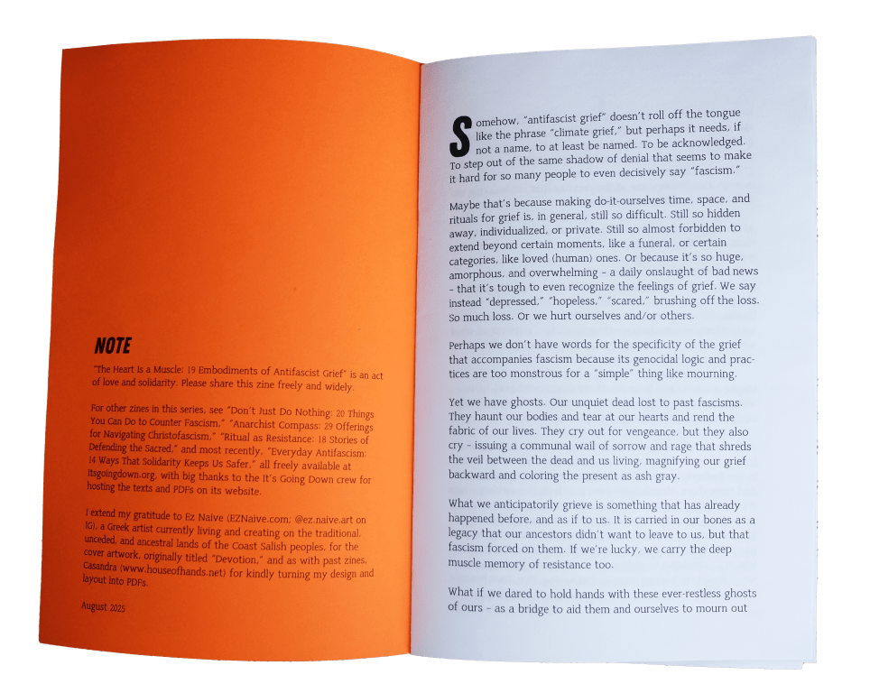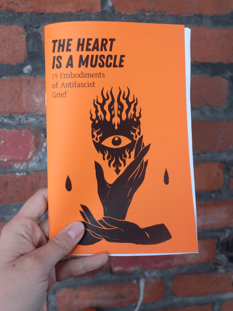 “Maybe it’s too early to speak of our “antifascist grief,” then, when we’re in the midst of all that’s causing it, or when we’re likely only at the beginning of this catastrophe(s). Yet it seems crucial to try, even if only to swap inklings of how grief is touching us now and thus know we’re not alone in our feelings — as many of the pieces in this zine underscore.”