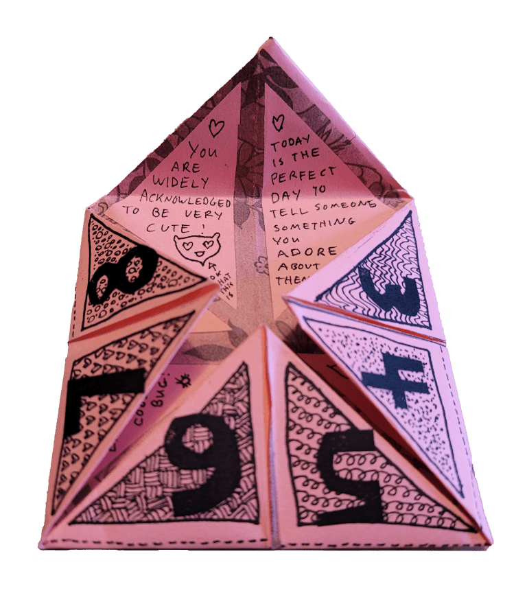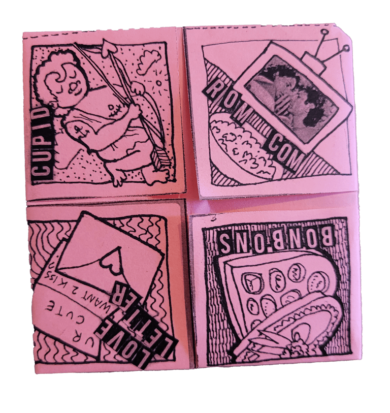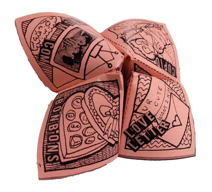 Valentine fortune-teller, printed on pink paper, with printing reading "rom com, cupid, bonbons, love letter" with illustrations of each