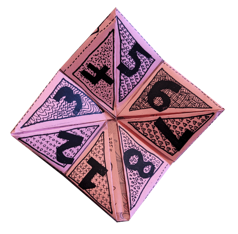 Valentine fortune-teller, opened to show hand-drawn numbers from 1 to 8